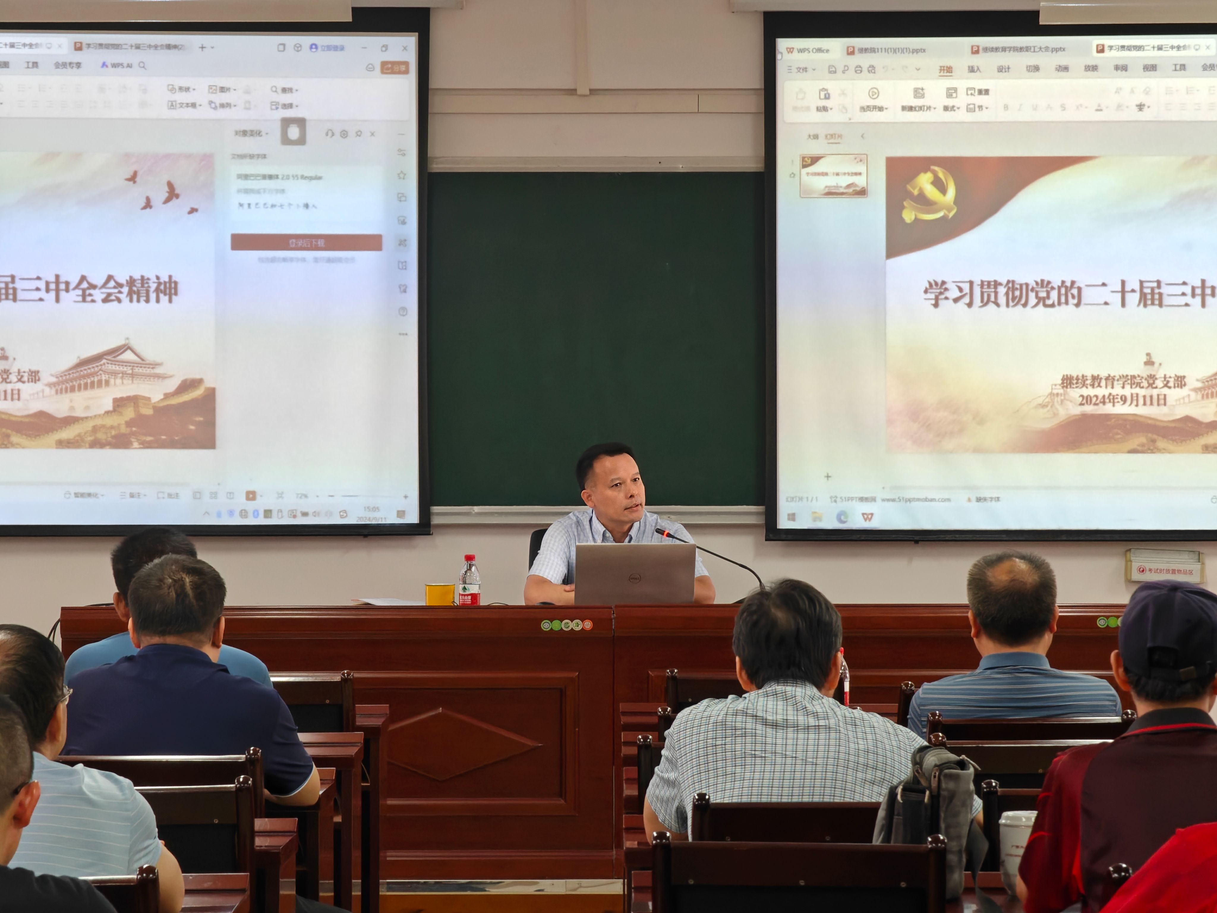 会上,继续教育学院党支部书记闭富春主讲《学习贯彻党的二十届三中全会精神》专题党课。党课重点解读了党的二十届三中全会的召开背景、主要内容和启示。