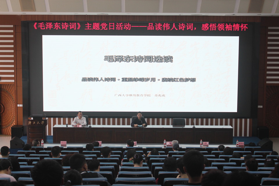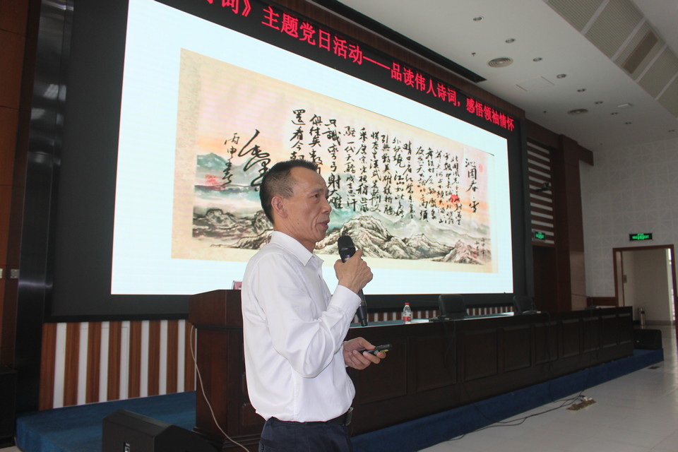 活动邀请继续教育学院院长苏兆成做导读,引领党员从求索立志、逐梦奋斗两方面去理解和赏析毛泽东从1906年起至1969年所作的数十首诗词,通过品读领袖诗词,重温峥嵘岁月,庚续红色梦想。