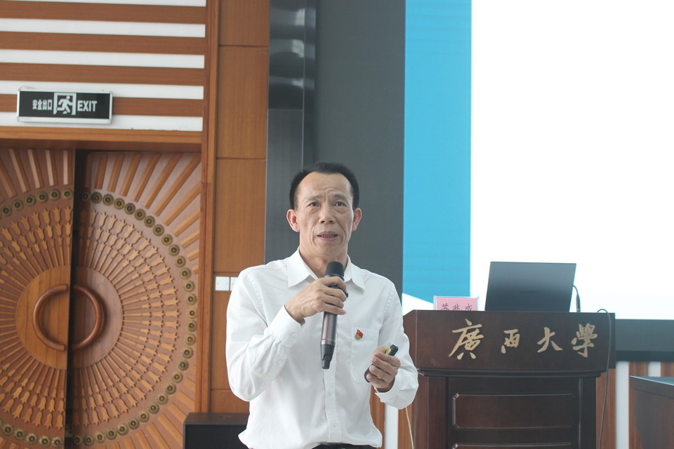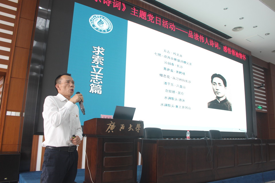 总会计师宁旭初参加了主题党日活动,并与党员分享自己品读毛泽东诗词的感悟和体会。他说,毛泽东的诗词,百读不厌,越是认真地读,就越觉得受教益、受激励、受熏陶。毛泽东的诗词是中国共产党领导全国人民开展人民解放、民族独立、建设强国、世界大同伟大革命斗争历程的艺术再现,是中国革命和社会主义建设的史诗,它像一面中国革命史的镜子,真实而艺术地反映了中国共产党从二十世纪开始近半个世纪的斗争历程。同时,毛泽东的诗词更是马克思主义中国化的诗化载体,我们党坚持解放思想和实事求是相统一、培元固本和守正创新相统一,不断开辟马克思主义新境界。党的十八大以来,以习近平同志为主要代表的中国共产党人创立了习近平新时代中国特色社会主义思想,这是当代中国马克思主义、二十一世纪马克思主义,是中国文化和中国精神的时代精华,实现了马克思主义中国化新的飞跃。我们要以习近平新时代中国特色社会主义思想为指导,勿忘昨天的苦难辉煌,无愧今天的责任担当,不负明天的伟大梦想,按照习近平总书记关于办好中国特色社会主义大学的要求,心怀“国之大者”,落实立德树人根本任务,弘扬广西大学“双一流”精神,全面推进广西大学“双一流”建设,以实际行动迎接党的二十大胜利召开。