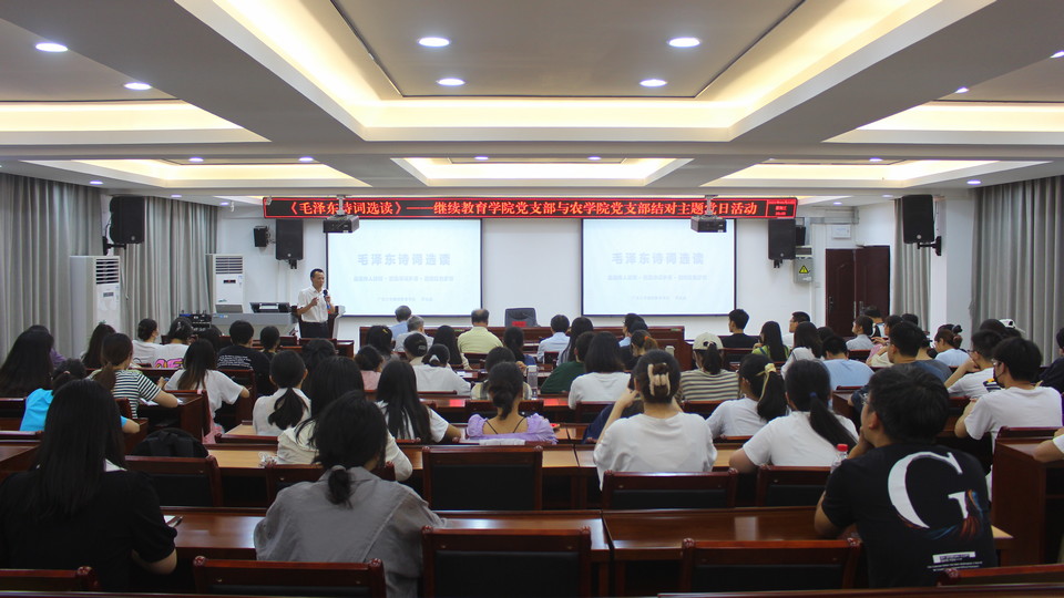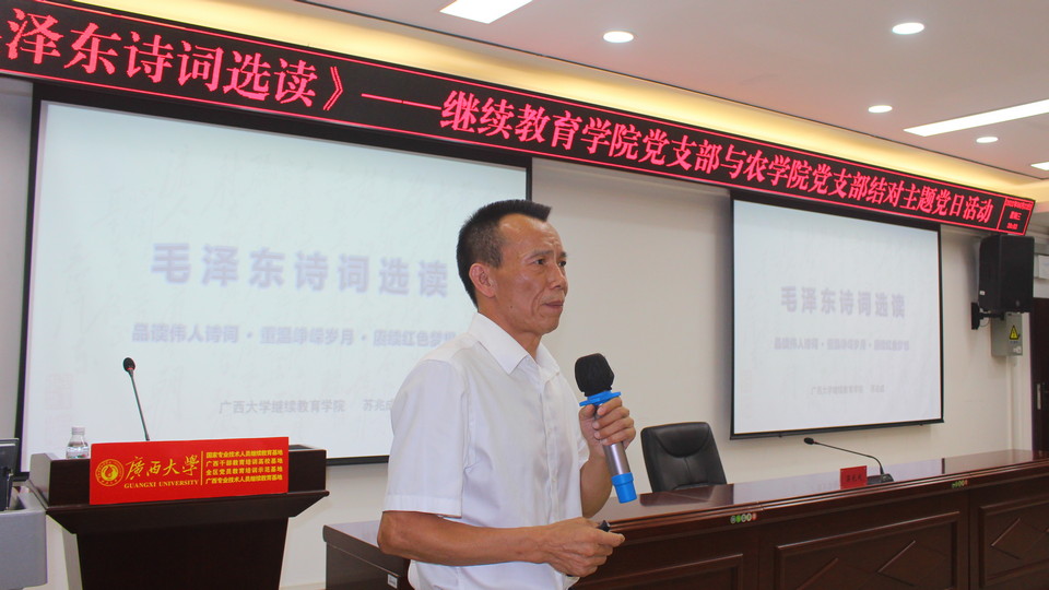 2022年6月22日晚,继续教育学院党支部与农学院有关党支部联合举办《毛泽东诗词选读》主题党日活动。主题党日活动由继续教育学院党支部书记苏兆成同志主讲。(陈昊宇/图)