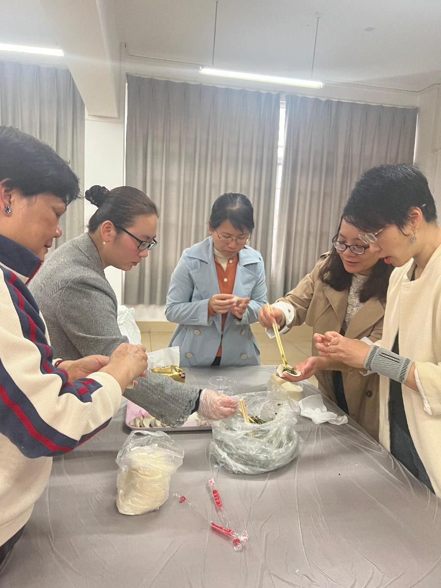 此外,活动还设置了丰富多彩的互动环节。在“人人动手,丰衣足食”的包饺子环节中,女教职工展现了自己的厨艺才华。谈笑间,各种形状的饺子如“金元宝”“半月”“扇形”等应运而生,既体现了女教职工的耐心与细致、也展现了她们的责任感、团队合作精神、和无私奉献的家庭美德。