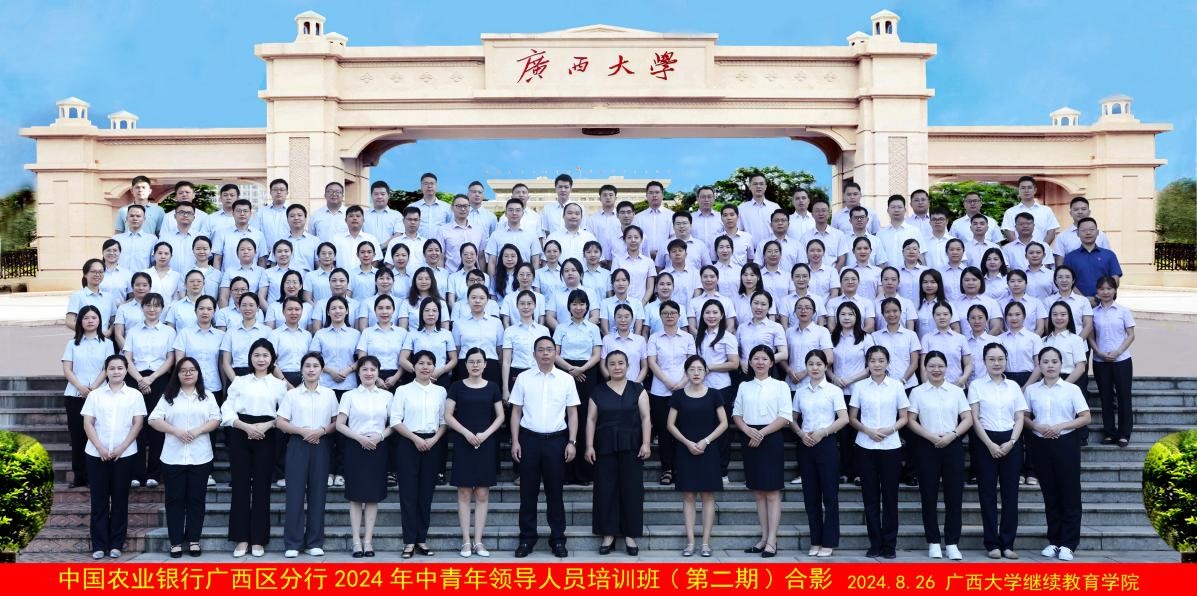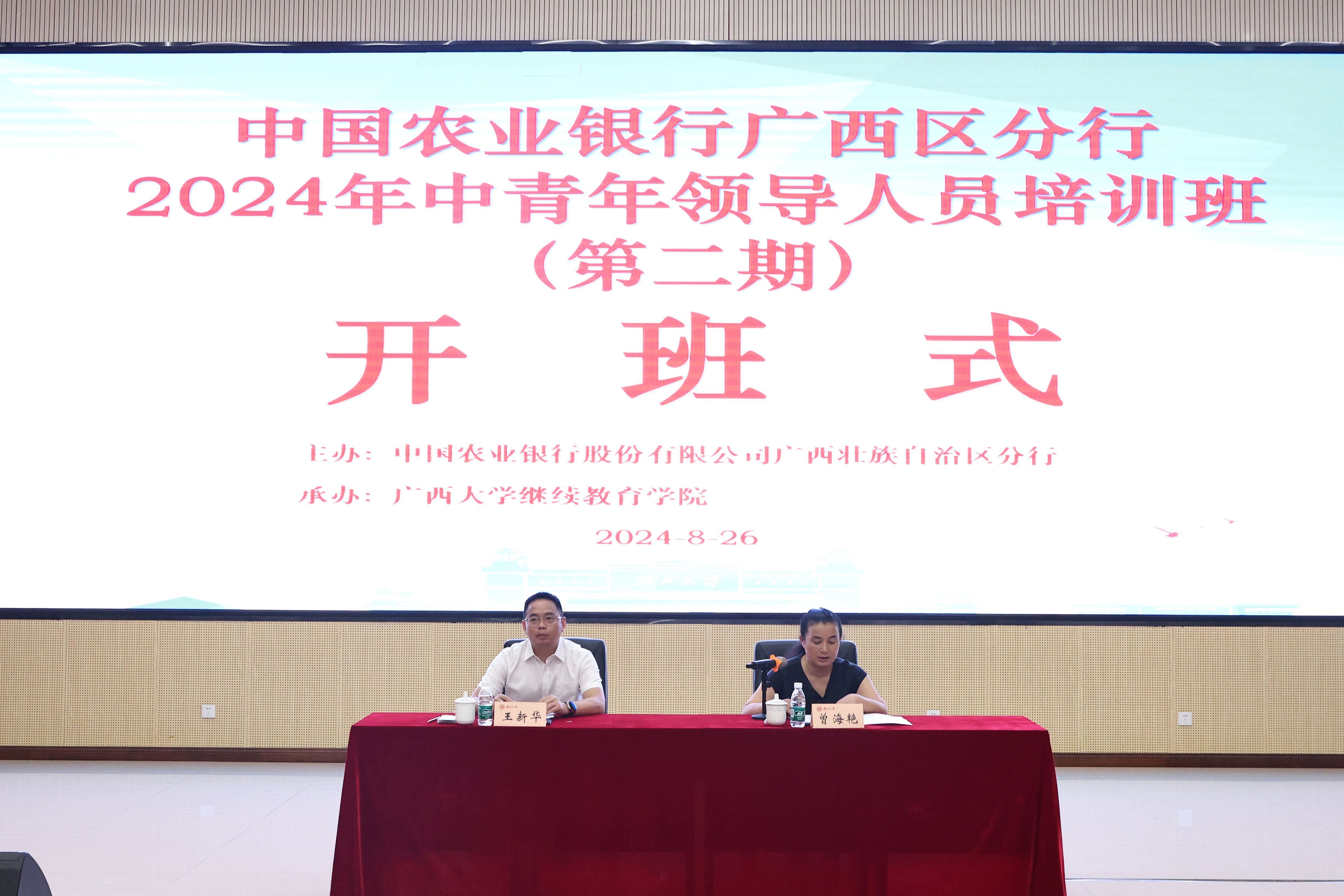8月26日,中国农业银行广西区分行2024年中青年领导人员培训班(第二期)在我院开班。中国农业银行广西区分行党委组织部副部长、人力资源部副总经理王新华出席开班式并作动员讲话,我院副院长曾海艳出席开班式并致辞。