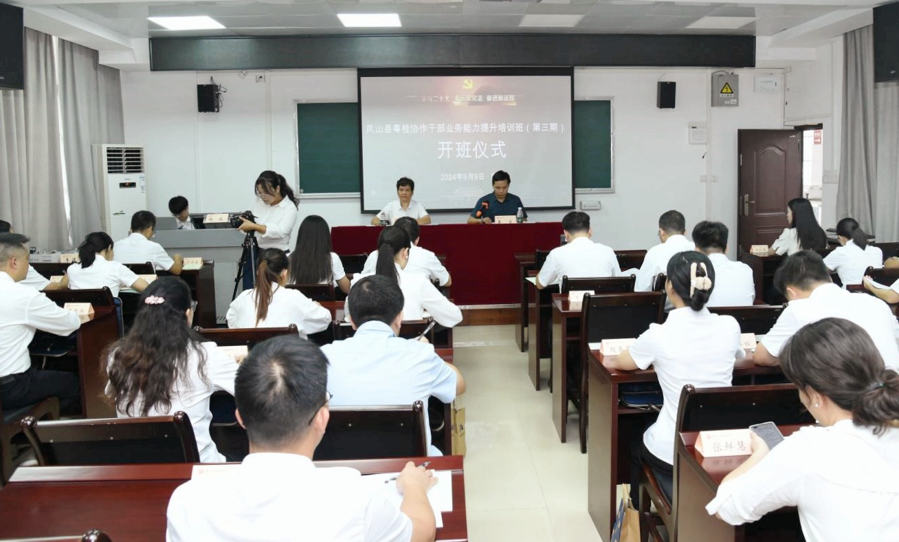 2024年9月9日,凤山县粤桂协作干部业务能力提升培训班(第三期)在我院开班。凤山县乡村振兴局覃凤雁副局长出席开班式并作动员讲话,我院培训中心副主任李文出席开班式并致辞。
